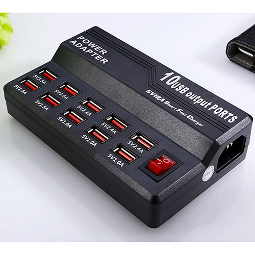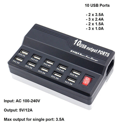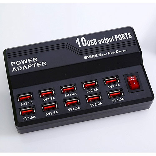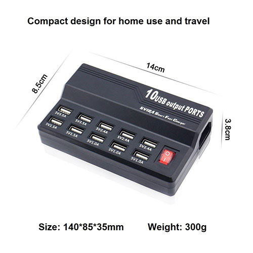 product description ?Features - Colour: Black - Input: AC 100V - 240V | Output: 5V / 12A 60W - Size: 140 * 85 * 35mm | Weight: 300 grams ?benefit - 10 ports: One provides a USB charger for all USB-powered devices, cell phones, tablets, mobile power or ignition, external battery, GPS, PSP, PS4 controllers, Bluetooth speakers / earphones, MP3 players and more. any, hotel, this multi-port USB charger is handy. - Smart Chip: Smart ICs can adjust the proper amp / voltage output for the device. - Fuse internal: overcharge, over-output, over voltage, over-voltage, over-temperature and short-circuit protection. This is a reliable charger that protects you and your digital devices. Multiple Ports - Up to 10 USB Ports (2 x 3.5A, 3 x 2.4A, 2 x 1.5A, 3 x 1.0A) Charge Up to 10 USB Devices at a Time Powerful and efficient - Input: AC 100V-240V, output 5V / 12A 60W, single USB port maximum output: 5V / 3.5A, multiple devices quickly charge Smart and Safe - Charging and Automatic Current Identification, Output Adaptation, Overcharge Protection and Fast Charge Technology Universal Compatibility smartphones, tablets, pads, cameras, GPS, power bank and more. Small and portable - Small and sturdy design, suitable for home, office and travel, Size: 140 * 85 * 35mm, Weight: 300g, Power cord: 1.2m