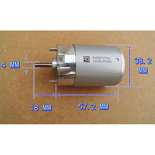 Motor Diameter: 36.5 MM (magnetic retaining ring is not included) Motor Length: 57.2 MM Motor shaft diameter: 4 MM Output shaft length: 18 MM Motor weight: 226 g Voltage: 12 V Current: 0.6 A Speed: 9800 RPM