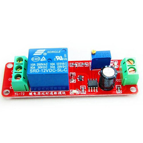 Size: 6.8cm * 2.1cm Main chip: NE555 Working voltage: DC 12V Features: 1, Power relay delay pull. Specifically: 12V power supply to the relay, the relay will not immediately sucked and status relay outputs are: normally open disconnected public, normally closed and public conduction; wait until the delay 1-10s (adjustable), the relay suction and, this time, the relay output status is: normally open and public conduction, normally closed and public disconnected; as long as uninterruptible power module, this state will remain. 2, The delay time is adjustable, (0 to 10 seconds) 4, Increasing the potential can increase the delay time 5, Increasing the capacitor C1 can increase the delay time 6, With input power indicator 7, With relay indicator 8, Can control AC 220V / 10A about equipment. (Maximum control equipment 2000W) 9, With freewheeling protection relay. 10, The delay time formula: T = 1.1RC. For example: a resistor capacitor 100uf 100K T = 1.1 * 100000 * 0.0001 = 11 seconds