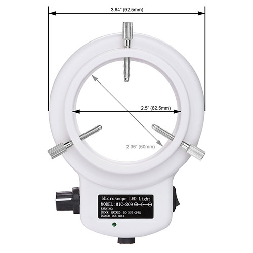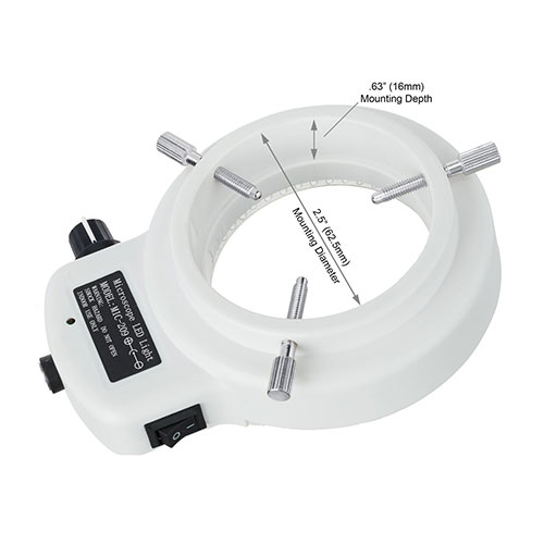 Provide intense and focused shadeless lighting Internal 2.5 "(62.5mm), External Diameter 3.64" (92.5mm) Power input: 110-240V, 50-60HZ, automatic switching Includes 1-7 / 8 "(48 mm diameter) ring adapter product description This is a 144-inch LED intensity-adjustable ring light for mounting a 2.4 "(61mm) stereo microscope with a 2.5" (62.5mm) internal ring and an external diameter of 3.64 "(92.5mm) from 100 -240V and comes with a 1-7 / 8 "(48mm diameter) ring adapter. Through variable brightness control, you can provide cool, uniform, intense and concentrated shadowless lighting. It is the ideal durable cold light source for all stereomicroscopes. The kit has a one-year manufacturing warranty Features and Specifications: - 144 bright white LED bulbs - 6000K color temperature - Variable intensity control - Strong and focused shadeless lighting - Power input: 100-240V, 50-60HZ, automatic switching - For 2.4 "(61 mm) mounting ring - Ring Light Inner Diameter: 2.5 "(62.5mm) - The mounting flange is 63 inches (16 mm) - The 48 mm thread mounting ring has an outer diameter of 53.75 mm - Overall OD: 4 "(100mm)