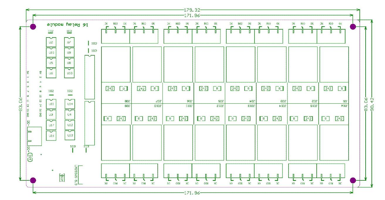 Features: New and high quality. · 5V 16-channel relay interface board, each requires 15-25mA drive current. With a large current relay, AC250V 10A; DC30V 10A. ? Standard interface that can be directly controlled by a microcontroller (Arduino, 8051, AVR, PIC, PLC, DSP, ARM, ARM, MSP430, TTL logic). Indicates the LED relay output status. Size: 18 cm × 9 cm × 1.8 cm (5.47 in × 2.04 in × 0.67 in).