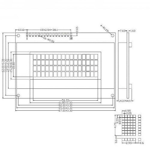 Display construction 16 Characters * 4 Lines Display mode TN/STN Display type Positive Transflective Backlight LED/4.2VDC Viewing direction 6 o'clock Operating temperature Indoor Driving voltage Single power Driving method 1/16 duty,1/4 bias Type COB (Chip On Board) Number of data line 8-bit parallel Connector Pin / ZEBRA Key Parameters Driver IC KS0066 (compatible with HD44780) Interface Parallel Backlight Blue Character Color White Character Set ASCII Dimension 87 * 60 * 13.5