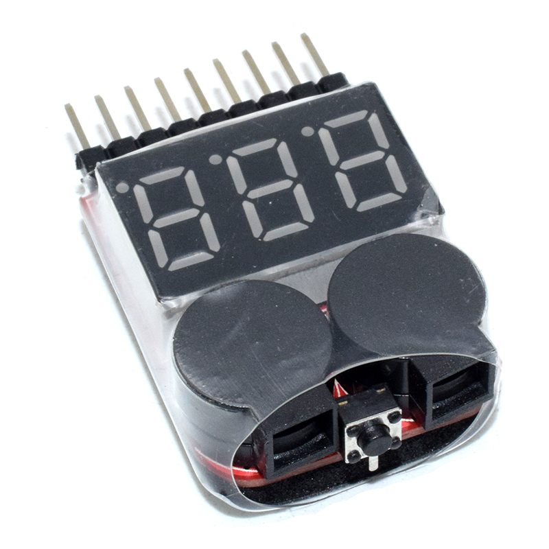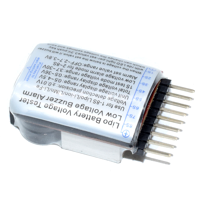 Product description Features: Usse for testing 1-8S Lipo/Li-ion/LiMn/Li-Fe Voltage Detection Precision: +/- 0.01V Unit Voltage Display Range: 0.5~4.5V Total Voltage Display Range: 0.5~36V 1S Test Mode Voltage Range: 3.7~30V Low voltage alarm mode for 2-8S Alarm Set Value Range: OFF~2.7~3.8V Size: 4*2.5*1cm Note: When the voltage is below the set value, it will buzzer with red LED Light, pre-set value 3.3V, press the key can change the voltage settings and save.