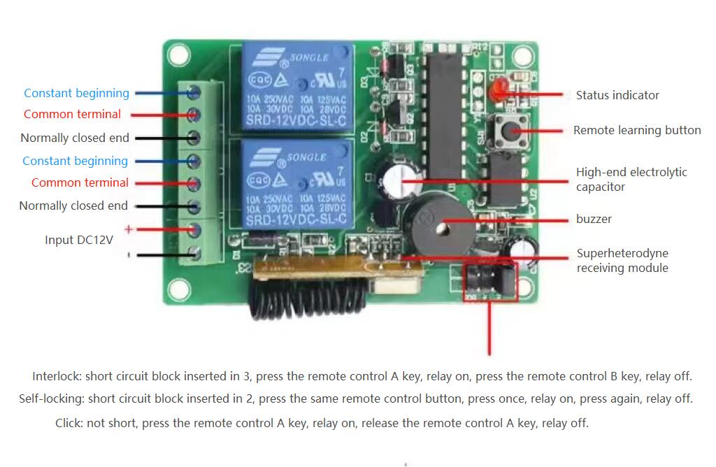 2 channel 10A relays 433mhz DC12V wireless rf receiver with wireless remote control 2 relays wireless outputs