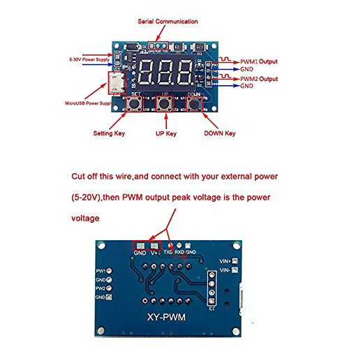 Digital square wave generator module supports 1Hz-150KHz frequency and 0% -100% duty cycle, through the onboard instantaneous button to adjust Dual channel frequency signal and duty cycle complementary output, easier to control DC5-30V wide voltage input (supports micro USB 5V input), 3-digit LED display, easy to read parameters, serial communication interface, easy to connect and MCU control Used as square wave source for instrument testing, driving stepper motor, PWM control motor speed / LED lamp brightness Fulfillment by Amazon will take 2-4 days for delivery by Icstation Fullfilled It will take 7-17 days for delivery normally product description This is a mini digital square wave generator module that supports 1Hz-150KHz frequency and 0% -100% duty cycle adjustment via on-board momentary pushbuttons and supports external communications. DC 5V-30V wide voltage input and dual-channel complementary output, the red LED shows the ideal parameters as a square wave source for instrument testing or drive stepper motor. Specifications: Frequency range: 1Hz-150KHz Duty cycle range: 0% -100% Accuracy: 2% Operating voltage: DC 5-30V Output current: 8-30mA Output amplitude: 5V V-PP (default is changed by external power supply) Module Size: 41X29mm / 1.61X1.14 inches (L * W) Package includes: 1X digital 2-channel square wave pulse signal generator module 1Hz-150KHz 0% -100% Display Description: There are 3 display range: 1: XXXX-> Unit 1Hz, range 1Hz-999Hz 2.XX.X-> unit 0.1KHz, range 0.1KHz-99.9KHz 3.XXX-> unit 1KHz, range 1KHz-150KHz, For example: 100-> 100Hz; 54.1-> 54.1KHz; 1.2.4 .-> 12KHz Setting Description: 1. Short press "Set" key to switch to display 4 values ??(FR1: PWM1 frequency; dU1: PWM1 duty cycle; FR2: PWM2 frequency; dU2: PWM2 duty cycle) 2. Press "Up" and "Down" to set the current value Serial port control: Baud rate: 9600pbs; Date bit: 8; Stop bit: 1; 1. Set the PWM frequency: "S1FXXXT": set the PWM1 frequency to XXXHZ (0001-999); "S1FXX.XT": set the PWM1 frequency to XXXKHZ (00.1-99.9); "S1FX.XXT": set the PWM1 frequency to XXX KHZ (0.0.1.-1.5.0.) (S1-> PWM1; s2-> PWM2; F-> frequency; D-> duty cycle; T-> stop bit) 2. Set the PWM duty cycle: "S1DXXXT": Set the PWM1 duty cycle XXX (001-100); "S2DXXXT": Set the duty cycle of PWM2 to XXX (001-100) 3.DOWN: set successfully; FALL: setting failed.