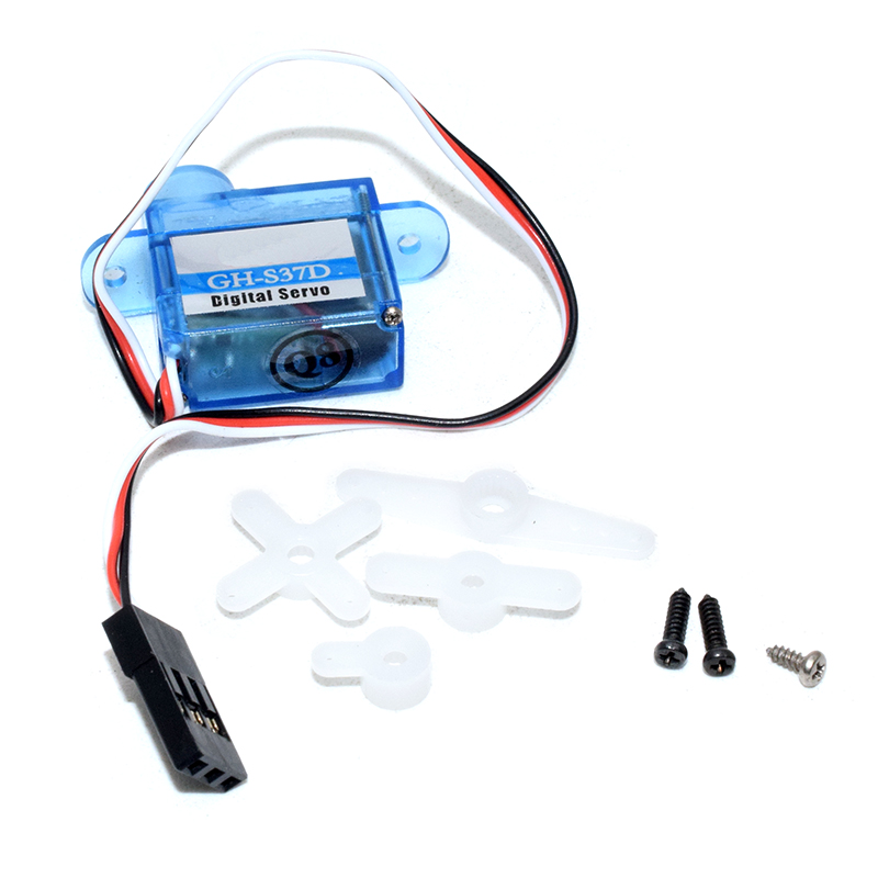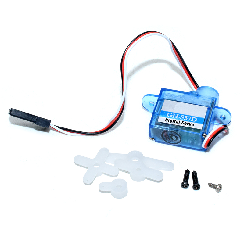 GH-S37A Product parameters: 3.7g rudder Structural material: plastic gear, hollow cup motor Connection length: 15CM Working voltage: 4.8-6.0V (do not exceed 6v, otherwise it will burn) Working current: <300mA Speed: 0.12sec/60° (at4.8v) 0.10sec/60° (at6v) Torque: 0.6kg/cm (at3.6v) 0.8kg/cm (at4.8v) Operating temperature: 0°-60° Standard signal: 1000-2000 microseconds Working angle: 90° Dead zone setting: 4usec Plug type: JR plug