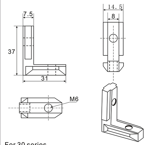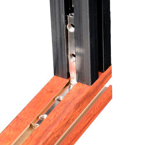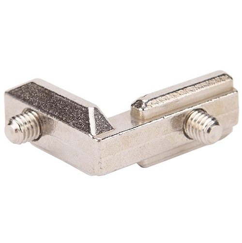 The L-type hidden corner bracket is used to connect two aluminum profiles at right angles. Insert both ends of the L-bracket into the profile slot and tighten the set screws to secure the two profiles.