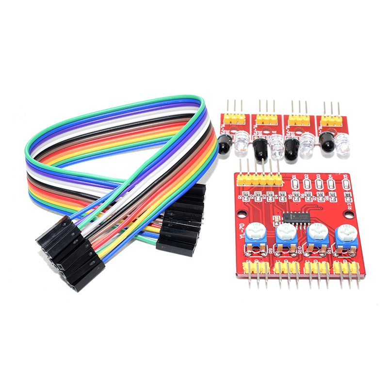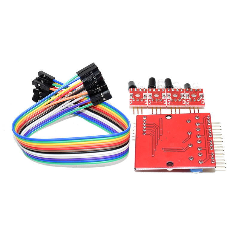 1. Operating Voltage: DC 3.3V-5V 2. Operating Current: try to choose more than 1A power supply 3. Working temperature: -10 ℃ - +50 ℃ 4. Install Aperture: M3 screws 5. Detection range: 1mm to 60 CM adjustable, the closer the more stable performance , white reflective distances. 6. Size: the control panel 42mm x 38mm x 12mm ,Small plates forward 25mm x 12mm x 12mm 7. Output Interface : 6 -wire interface (1234 4 -way signal output, + positive power - power that is negative ground) 8. Output signal: TTL level (can be directly connected microcontroller I/#0, is reflected back to the sensor sensing infrared light, the red light is on, the output low; when no infrared light, the light is not bright, high power output level.)