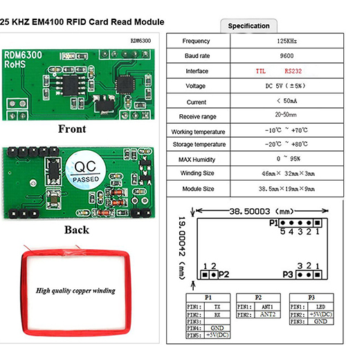 Arduino 125K RFID Card Reader Module RDM6300 ID RF Module UART Output