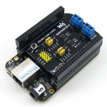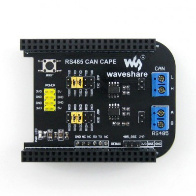2.CAN pinheader 3.CAN screw terminal 4.RS485 pinheader 5.RS485 screw terminal 6. DEBUG interface: Used to debug BB Black or other connected modules 7. Power Expansion pinheader: used to connect an external power supply 8.BB black BOOT select button 9.CAN transceiver 10.RS485 transceiver 11. Power indicator 12.BB black UART TXD select jumper 13.BB black UART RXD select jumper 14. RS485 transceiver enable jumper