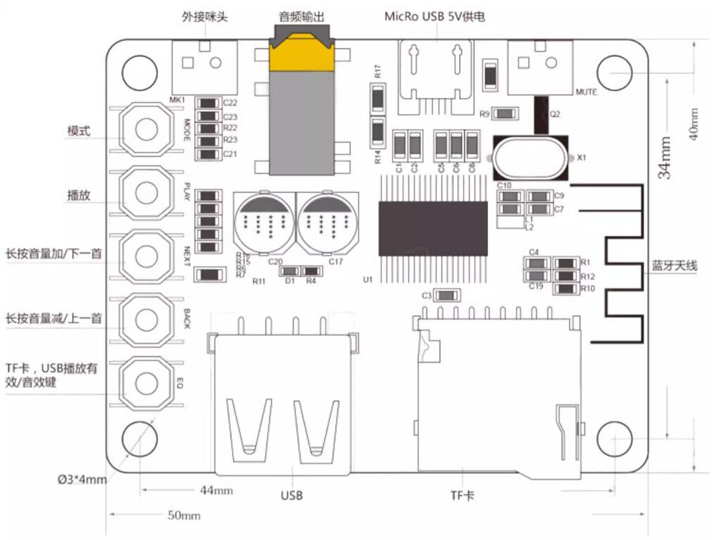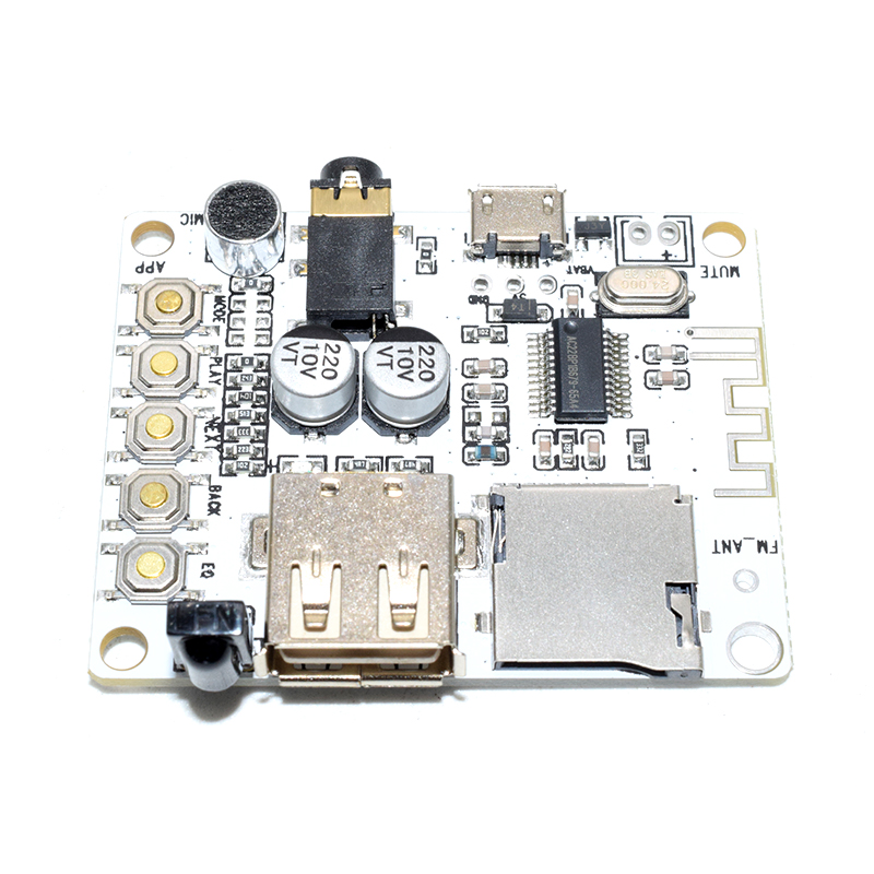 Switch the mode to Bluetooth mode by pressing the MODE button. At this time, the voice prompt "waiting for connection" and the LED indicator light will flash. Turn on the Bluetooth function of your phone, search for the device name of the product: BluetoothAudioV2, click on the device to connect, and after connecting, the voice will prompt "connection successful" and the LED indicator light will remain on. Click on the song to play on your phone, and the headphone jack on the product will output audio playback. At this time, the LED indicator light will flash slowly. The song can be operated through the buttons on the board or remote control.