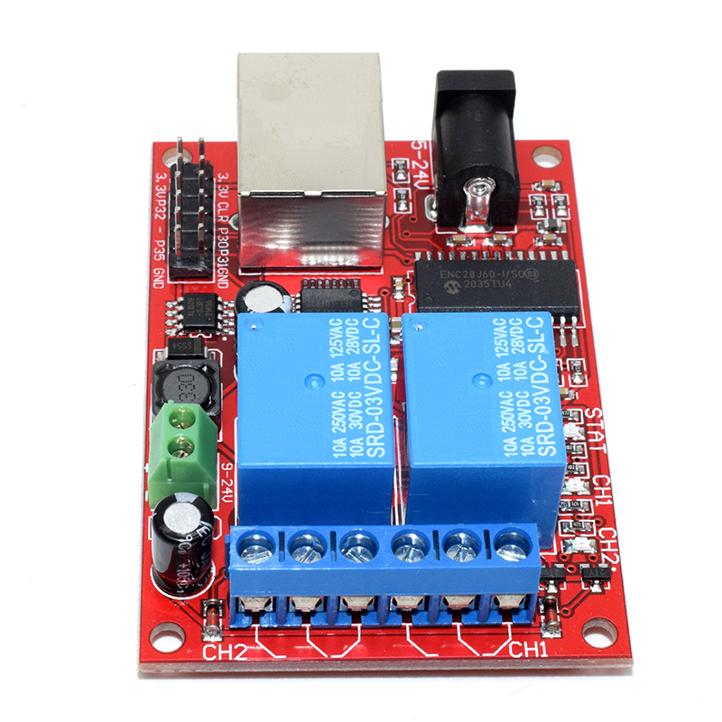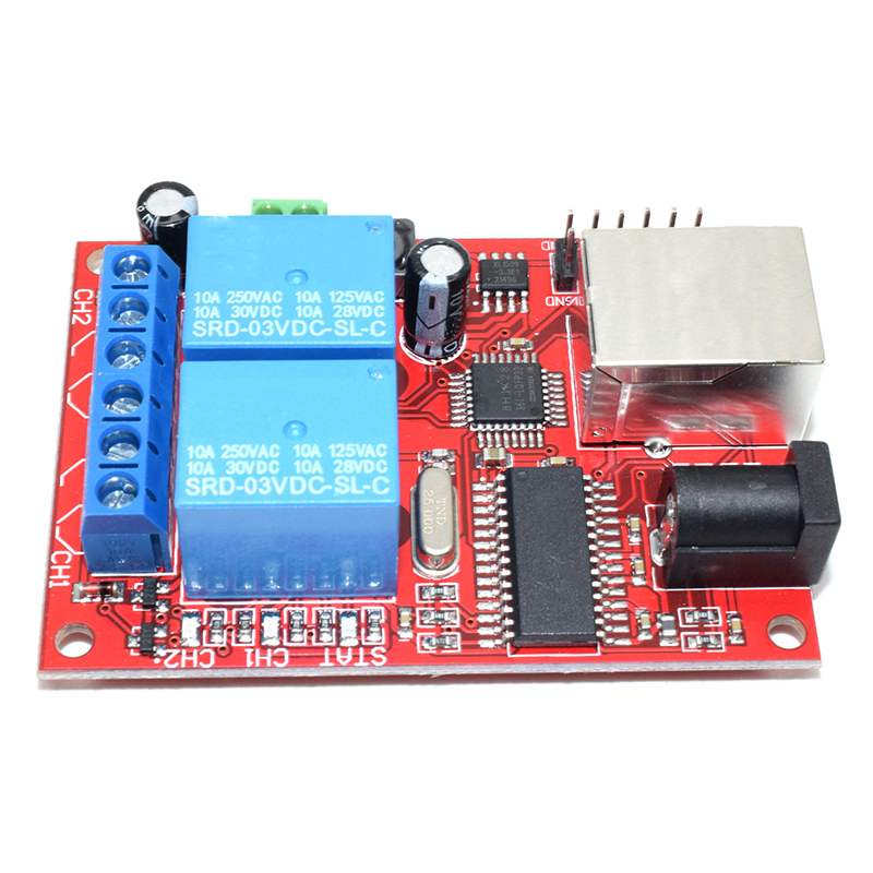 Product description Industrial-grade STC microcontroller as the master chip; Onboard 2 high-quality relays, relays with absorption diode circuit; With 1-way power indicator, each relay has a status indicator, light on the relay pull; Re-expand the relay module to reach 8 outputs, Note: The relay module should be active high; You can configure the module parameters through the network, such as the module IP address, the default gateway and so on; Keep the status of the relay before power-off (configurable); Through the internet control, cloud remote control by the local password protection, safe and reliable; Support 5-24V input voltage, two kinds of power supply terminal two choose one: 1.6mm thick PCB made of military-grade FR-4 board, PCB size 70mm X 50mm, reserved mounting holes;