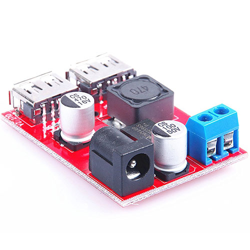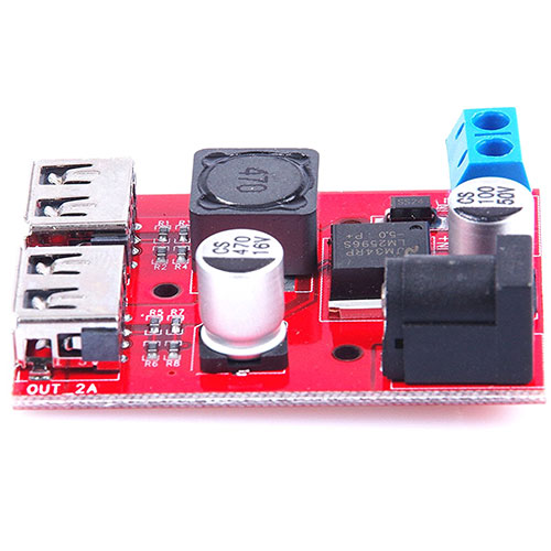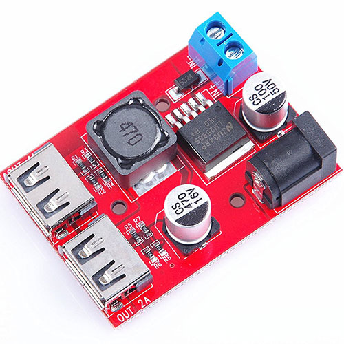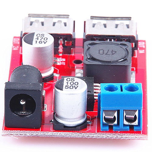 Product description This is a mini DC step down voltage converter module with fixed 5V voltage output. On-board DC 5.5X2.1mm power jack socket and 2pin screw terminals as the input power port with DC 6-40V voltage input and 2 USB power output port ideal for DIY USB charger for your electronic devices such as poWer bank,smart phone, tablet or 9V/12V/24V/36V to 5V converter module. Specifications: Input Voltage: 6-40V Output Voltage: 5V Maximum Output Current: 3A Maximum Conversion Efficiency: 92% (MAX) Switching Frequency: 150KHz Input Port: DC5.5*2.1mm power socket, 2p screw terminal Output Port: USB(dual port) Module Size: 50 X 35 X 12mm/1.97 X 1.38 X 0.47inch(L*W*H) Package Included: 1X DC Voltage Regulator Module 6-40V to 5V 3A Dual USB Output Product information Package Dimensions 7 x 4 x 0.4 inches Item Weight 0.32 ounces