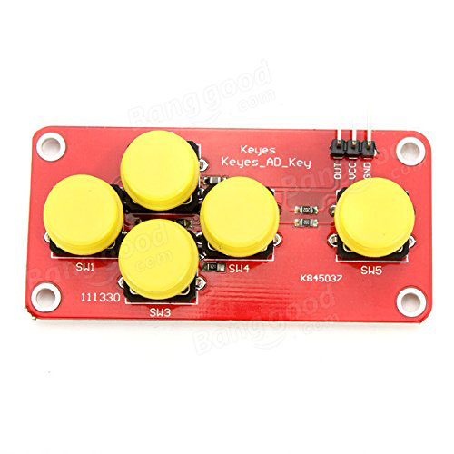 Product description AD Analog Keyboard Module Electronic Building Blocks For Arduino Description: AD Analog Keyboard Module Electronic Building Blocks For Arduino,port is compatible expansion board sensor analog keyboard,5 keys only takes an analog port , save resources , analog acquisition, press different keys output different voltage , high quality Omron button, sensitive and durable, compatible arduino sensor interface Package included: 1 x Analog Keyboard Module