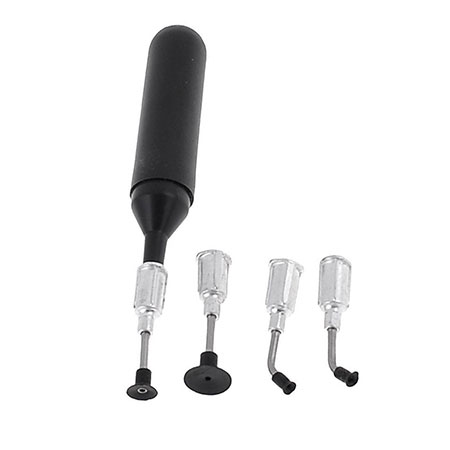 his handy set is a pick and place tool, which is simple to operate. It includes 4 probes and 4 suction cups. Cup is made of anti-static material and free of silicone . There is no damage and pollution to the product. It's widely used in SMT parts, metal parts, plastic parts or any item having a smooth and nonporous surface that the rubber vacuum tweezer tip can seal against. - Comes with 4 suction pads of various sizes- No battery required- Handful for sucking up electronic parts for DIY installations