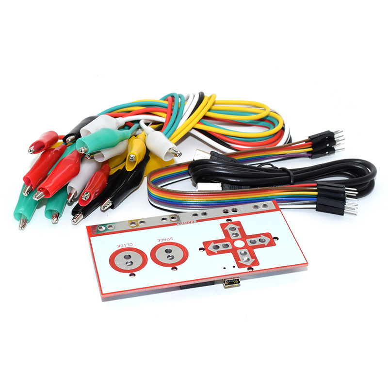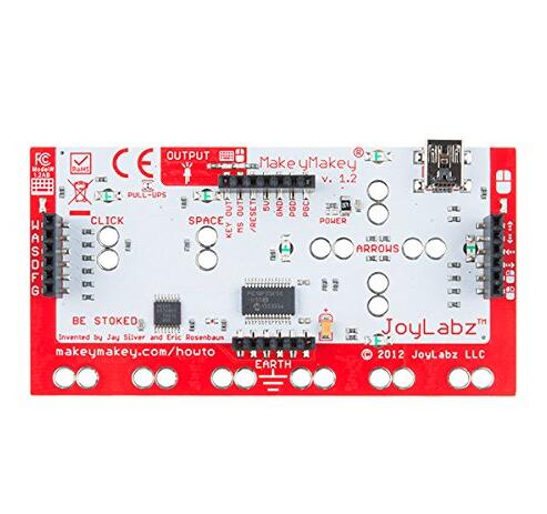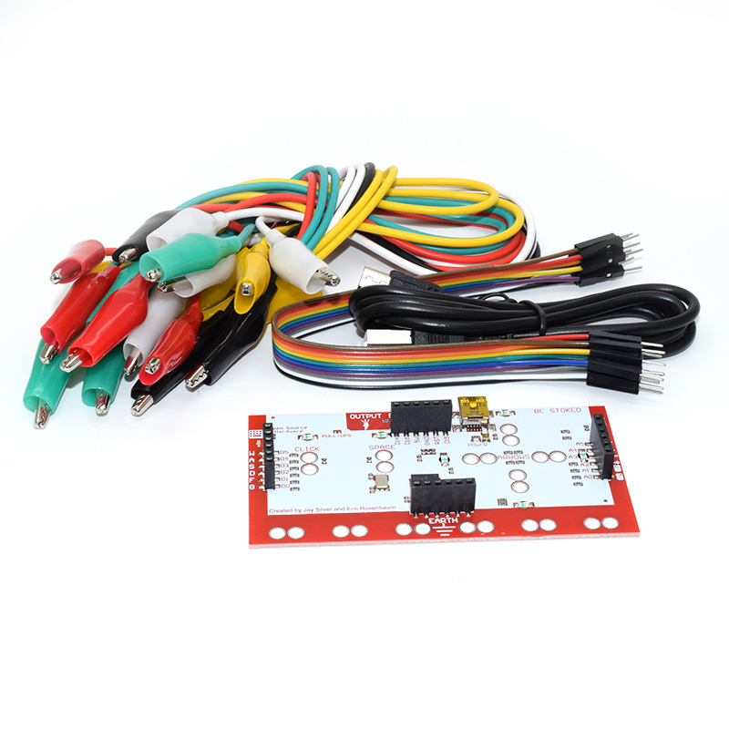 You may be the greatest living banana pianist, but how will you ever know if you don’t make yourself a banana piano? Good news! That project and countless others are easier than you think with Using the you can make anything into a key just by connecting a few alligator clips. The Classic by JoyLabz is an invention kit that tricks your computer into thinking that almost anything is a keyboard. This allows you to hook up all kinds of fun things as an input. For example, play Mario with a Play-Doh keyboard or piano with fruit! The Classic uses high-resistance switching to detect when you’ve made a connection even through materials that aren’t very conductive (like leaves, pasta or people). This technique attracts noise on the input, so a moving window averager is used to lowpass the noise. The can also act like a keyboard or mouse. There are six inputs on the front of the board, which can be attached to via alligator clipping, soldering to the pads, or any other method you can think of. There are another 12 inputs on the back, six for keyboard keys and six for mouse motion, which you can access with jumpers via the female headers.