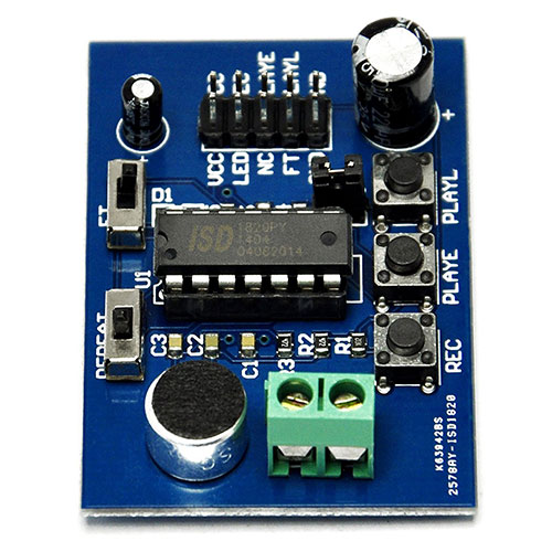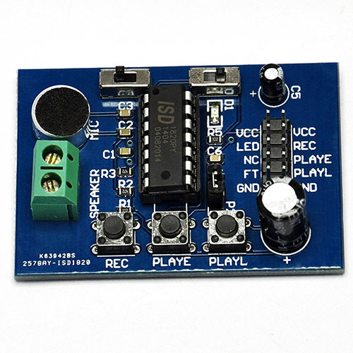 1. with on-board ISD1820 chip 2. onboard microphone, can record directly 3. about 10 seconds voice recording 4. high-quality, natural voice restore can be used as a loudspeaker module 5. with a loop playback, jog playback, single-pass playback 6. the chip pin leads, through the microcontroller to control operation 7. Operating voltage: 3 ~ 5V 8. board size 54 (mm) x 38 (mm)
