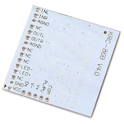 Product description KRC-86B Bluetooth 4.0 Stereo Audio Receiver Module Description: Using CSR8630 Bluetooth chip that supports A2DP, AVRCP,Bluetooth version:V4.0+EDR Automatic control technology, simple operation, easy to useIf the connection button, you can control your phone or computer to play / pause, volume change It supports two devices simultaneously connected Support power offautomatic connection function Function: VCC:Positive power supply 3V-5V GND:Negative oneLED+:Connected diode anode LED-:Connected diode cathode AGND: connected to an audio signal Cathode OUTR:Right Output OUTL:Left Output INR:AUX right input INL:AUX left input com: button common terminal Play / Stop: Play / Pause VOL + / NEXT: short press next song, long press volume up VOL - / REV: short press last song, long press volume down EN: Bluetooth connection is high level (3.3V), disconnect the Bluetooth low level NC: Function Reserved Package included: 1 xKRC-86B Bluetooth 4.0 Stereo Audio Receiver Module
