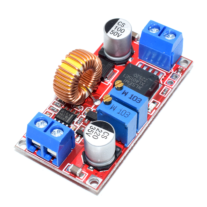 The module combines the efficient XMLSEMI XL4005 DC-DC step-down converter IC with the TI LM358 op amp for stable current regulation. This module provides higher efficiency than modules based on the LM2596 and XL4015, which means your device has less heat and more power available. Maintains a stable output voltage and limits the output current in the input voltage range. Ideal for general voltage conversion, battery charging, powering of raw LEDs, automotive electronics, battery switching, microcontrollers and electronics. Input Voltage: 5-32V DC, Output Voltage: 0.8-30V DC, Maximum Load: 75W / 5A Peak, 50W / 3.5A Duration (whichever is lower, amps or watts) Conversion efficiency: up to 95%, (our test results: 24V-> 12V1A: 92.7%) The input must be at least 1V above the output voltage. Applying reverse polarity voltage to input or output may damage the module. Size: 51x26.3x14mm, XL4005 IC, 300KHz switching frequency