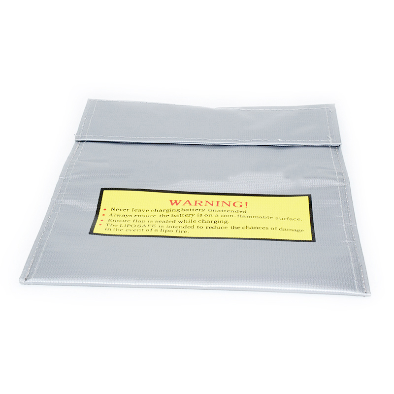 LiPo Guard Safety Bag (30 * 23cm) for Safe Battery Charging and Storage This fire-retardant bag is a convenient way to protect your LiPo battery during charging, transport and storage. Just load the battery into the bag, route the cord through the vents on the sides of the top cover, and fold the cover to seal the industrial hook and loop fasteners. Product Specifications: Material: fiber Color: silver Size: 180 x 230mm Thickness: 6mm Weight: 125g / 4.41oz Package Weight: 143g / 5.04oz Note: LiPo Guard is used to reduce the damage caused by an accident without substantially damaging the surrounding objects. Never charge the battery unattended, follow all safety charging and storage procedures. Important note: Lithium-polymer batteries can be very dangerous if not used properly and do not leave the battery unattended. Note: If you want to take lithium battery, please read the product manual carefully. Jumper connection should be correct, to prevent burning ESC. Note: The battery is not included! "