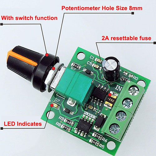 The DC motor speed controller allows the DC motor to be controlled using a pulse width modulated (PWM) DC voltage and the duty cycle can be fully adjusted from 0% to 100%. The motor speed controller comes with a self-healing fuse 2A and a Power-On LED. It can easily provide 2A continuous current to your DC motor or other DC loads. The main technical parameters: Input supply voltage: 1.8V-15VDC Maximum output power: 30W Maximum continuous output current: 2A Adjustable duty cycle: 0% -100%; Specifications: Project Size: 32 * 32 * 15mm; Package: 1 motor speed controller; Instructions: 1. Connect the DC motor (or DC load) to the motor terminals according to the wiring diagram. 2. Connect a 1.8V-15V DC voltage to the circuit to ensure that the polarity of the connection is correct. Please note that the voltage applied to the motor is the supply voltage applied to the circuit. To protect the circuit from any possible short circuits, it is recommended to add a properly rated fuse to the positive power supply line. 3. The speed of the motor can now be controlled via a potentiometer. Important: It is recommended to use an appropriately rated fuse rated slightly above the maximum expected current to ensure safe operation. Controller using self-recovery fuse 2A is safe. If the power voltage is connected in the wrong polarity, it will be damaged. Please check all connections carefully before turning on the power and always turn off the power before changing the wiring Product weight 0.32 ounces Product size 3.5 x 2.1 x 0.7 inches