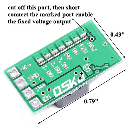 Product introduction: 1. Input voltage: DC 4.5-24V 2. Output voltage: adjustable integral, fixed output, the back of the output voltage can be selected 3. Adjustable range: 0.8-17V, fixed voltage (1.8V 2.5V 3.3V 5V 9V 12V) 4. Output current: 3A (maximum), the actual test input 12V output 1.5A 5. Conversion efficiency: up to 97.5% (6.5 to 5V 0.7A) 6. Switch Frequency: 500KHz 7. Output ripple: 20mV 12V to 5V 3A) 20m bandwidth 8. Working voltage: -40 degrees Celsius -85 degrees Celsius 9. Output over-voltage protection: None 10. Quiescent current: 0.85MA Load Regulation: ± 1% 12. Voltage regulation rate: ± 0.5% 13. Dynamic response speed: 5% 200uS 14. Output short circuit protection: yes 15. Input Conversion Protection: None 16. Start Control: Yes 17. Connection: welding 18. Input Method: Welding 19. Output Method: Welding / Pin 20. Welding pitch: 2.54mm