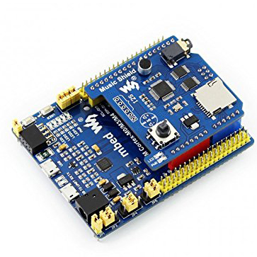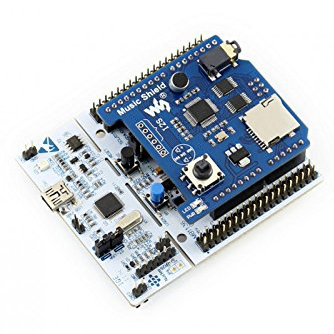 Product Features On-board TF card slot, you can directly play TF card audio files On-board MIC for recording with standard 3.5mm 4-segment headphone jack On-board voltage level converter 74VHC125, compatible with 3.3V / 5V MCU One-touch control, easy music playback and volume adjustment via navigation keys Function I2S and MIDI interface function expansion product description Music Shield is an Arduino expansion board for playing / recording audio, onboard audio codec VS1053B and TF card slots, supporting popular audio formats. Arduino standard interface, compatible Arduino UNO, Leonardo, NUCLEO, XNUCLEO Arduino board support formats: MP3 / AAC / WMA / WAV / MIDI, etc.