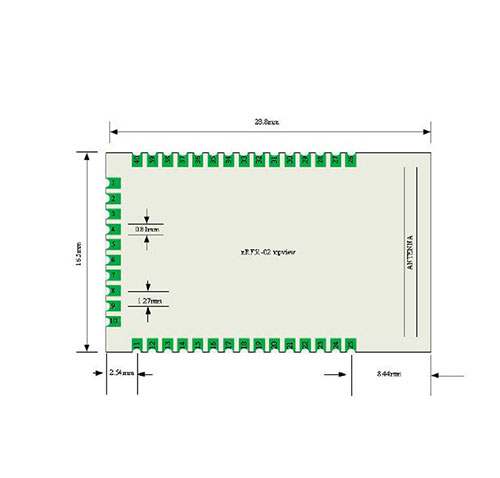 nRF51822-02 module is a transparent data transmission module, the use of Bluetooth BLE, Nordic companies have integrated the SOC chip nRF51822-QAFF, internal integration of the underlying low-power Bluetooth 4.0 standard protocol, the module interface is a standard UART interface, Built-in interrupt output prompt, when pairing Bluetooth module to receive data transmission, it will output a high warning signal to the external device, and the module configuration of the hardware enable pin, no data transfer, can be set to high by the enable pin To disable serial data transfer, thereby reducing system power consumption. Module Features Bluetooth low-power single-mode chip BLE4.0; Integrated standard BLE4.0 protocol stack; Standard UART (TTL) interface for direct connection to an external MCU serial port or serial peripheral; Optional hardware serial port baud rate 9600 or 38400, the default is 9600; Interrupt output prompt; Hardware enable control Working distance: 0-20 meters, two; Power supply voltage: 3.3V Module comes with PCB antenna, you can also use an external antenna; Module size: 16.5 * 28.8mm. Module dimensions