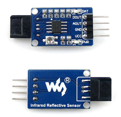 Reflective infrared sensor Product Introduction product description: Using a wide voltage LM393 voltage comparator Adjustable sensitivity Signal output indication Product parameters: Operating voltage: 3.0V ~ 5.3V Dimensions: 30.2mm * 11.9mm Fixing Hole Size: 2.0mm The main purpose: Robot tracking, obstacle avoidance and trolley lines counting Interfaces to access the MCU as an example :() VCC: 3.0V ~ 5.3V then GND: GND connection AOUT: pick MCU.IO (analog output) DOUT: pick MCU.IO (digital outputs)