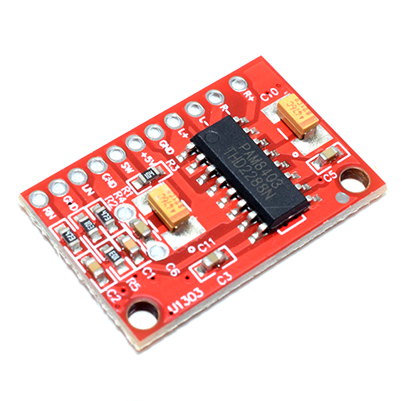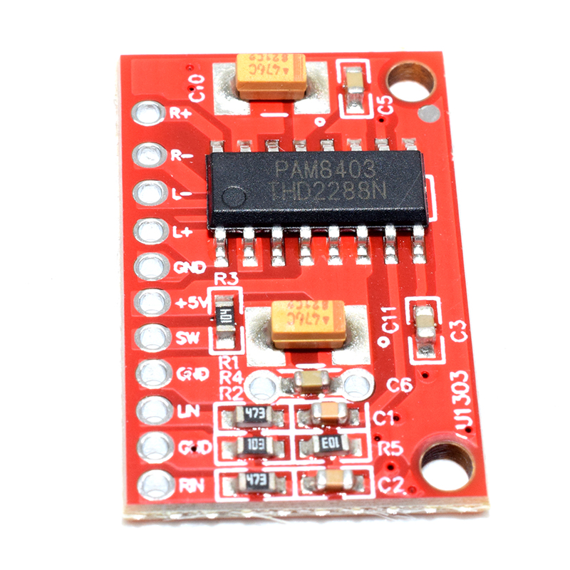 XH-M179 PAM8403 Amplifier Module High Power 2 Channel 3W Audio Super Mini Digital Amplifier Board Features: Special internal output processing circuit, eliminating the traditional LC network, EMI value is lower than the LC! Maximum power output at lower voltages, ultra high power internal electronic switch bracket, built-in high gain buffer amplifier Built-in short circuit protection. "Power": 3.6 to 5.5V, single lithium battery or USB power supply is appropriate, it can be four 1.2V battery, the power transformer must be added 5V regulator circuit chip to burn more than 5.5V. parameter: Power: DC (DC): 3.6V-5.5V Output power: 3W + 3W (4Ω) SNR: 90dB Efficiency:> 90% Size: 24 * 15.5 * mm Positioning hole size: 20mm Pitch spacing: 2mm note: 1: Positive and negative power supply can not be reversed, the supply voltage can not exceed 5.5V, these two violations may cause IC damage. 2: On-chip high-gain buffer, board can not change any component parameters do not meet the parameters will cause IC damage. 3: Please try to use shielded cable input cable, can play a role in anti-jamming, clutter current to eliminate the sound. 4: Output CMOS tube In BTL drive mode, the speakers can not be together negative, that is, the four lines connecting the speakers are completely independent and do not allow total access!