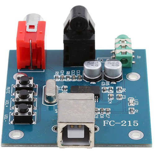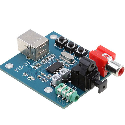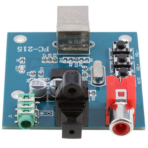 Product description Description: - -The main chip uses HIFI grade PCM2704 USB decoder chip, its performance is better than the market commonly used low-end chip CM102S series, power supply using USB power supply, the output can be directly connected to the headset, but also to do the forefront of digital output can be more DAC decoder to provide SPDIF digital signal to get better sound quality. - -As a result of external sound card, to avoid the chassis of the serious electromagnetic interference, signal to noise ratio and sound quality can be improved. - -PCM2704 is a monolithic analog-to-digital converter chip. It has two digital-to-analog output channels and an integrated USB interface controller. The interface conforms to the USB 1.1 standard. PCM2704 can receive 48KHz, 44KHz and 32KHz sampling rate of 16-bit stereo or mono audio data, chip integrated software volume and mute function, you can adjust the computers volume and mute. Specification: - PCM2704USB sound card DAC decoder USB input coaxial fiber HIFI sound card decoder fever - Color:blue - Material:Metal - PCM2704 USB sound card / DAC decoder - Size:65 * 50 * 20MM - USB input, coaxial, fiber, analog output. - Technical Parameters: - Supply voltage: 5 V (USB powered) - Distortion: THD + N: 0.006% (RL Greater than 10 kOhm) - Distortion: THD + N: 0.025% (RL = 32 Ohm) - Signal to noise ratio: 98 dB - Dynamic range: 98 dB - Headphone output power: 12 mW (RL = 32 Ohm) - USB support Sampling rate: 16Bit 32k - 48k