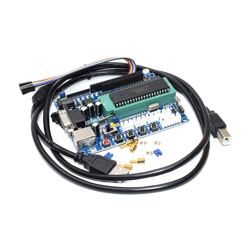 Product features An external 12V power supply; also USB powered; Onboard there MAX3232 chip, do serial communication experiment; 8bit light water experiment; LCD interface, with 12,864; LCD Interface with 1602; With two DS18B20 temperature sensor interface; with an integrated infrared receiver, to do remote control experiments; CPU all the IO ports and power VCC, 3.3V, GND are outside the lead out to facilitate the various functional test; With four separate buttons, and buttons do interrupt experiments; Onboard a reset circuit can be manually reset; Product description This product is a high cost PIC microcontroller development board, USB and external 12V DC power supply, provides ICSP download debugging interface with PIC-Circuit Debugger (PICKit2 & ICD2, etc.), or the programmer (K149 & K150, etc.) to facilitate the for program debugging, downloading. Completely independent of the IO port design, compatible with a variety of models, various DIP Series package MCU. PIC877A board development board has a wealth of resources that will catch PIC microcontrollers internal resources, you can get the full learning applications. Freedom with the MCU peripheral circuit design, the user can be used to implement various experiments. By PIC877A development board learning applications, as well as on the development board schematics and incidental learning reference routines, each routine has done a detailed notes, from the simple to the complex layers of depth. Users can easily and convenient to master PICs internal resource utilization and system software development An external 12V power supply; also USB powered; Onboard there MAX3232 chip, do serial communication experiment; board provides 5V and 3.3V voltage; 8bit light water experiment; LCD interface, with 12,864; LCD Interface with 1602; With two DS18B20 temperature sensor interface; with an integrated infrared receiver, to do remote control experiments; left ISP download port; Onboard with 6M crystal; CPU all the IO ports and power VCC, 3.3V, GND are outside the lead out to facilitate the various functional test; With four separate buttons, and buttons do interrupt experiments; Onboard a reset circuit can be manually reset;