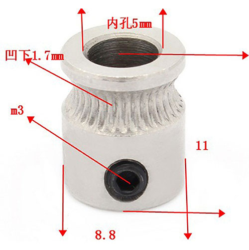 Size: 11 mm (height) × 9 mm (outer diameter) Effective diameter: 7 mm Shaft / hole size: 5mm Material: stainless steel The high-quality stainless steel MK8 drive offers up to 35% more power than the plastic filament grip MK7 in 3D printers, and the deep grooves provide good retention of 1.75 mm and 3.00 mm filaments. For 5mm shafts with Allen / Hex flat-head screws. Package Included: 1 x MK8 drive gear for 1.7 / 3mm plastic filament "