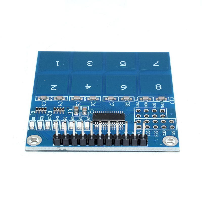 Product Features Product Name: 4-way capacitive touch button digital sensor module; chip: TTP226; Operating voltage: DC 3-5v Fixing hole DIA: 3mm / 0.12 "; Fixing hole center distance: 40mm / 1.6" Overall dimensions: 47.5 x 46 x 11 mm 1 7 "x 1.6" x 0.43 "(L * W * H) PCB thickness: 1mm / 0.04" Housing Material: Plastic; Color: Blue DC 3-5v 8-channel capacitive touch button digital sensor module, you can set the output / input mode, fast / low power consumption.