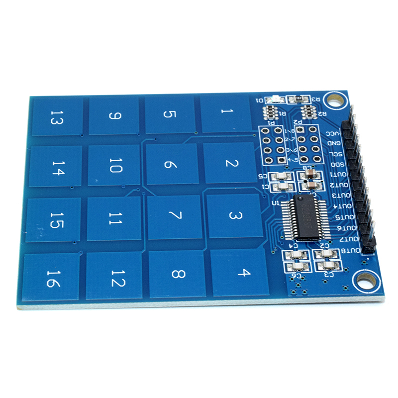 product description The capacitive touch sensor module uses the TTP229 integrated circuit to easily add capacitive touch inputs to your project. With 16 sensitive touchpads, it is an ideal replacement for an older keyboard. specification ? On-board 16-key TTP229 capacitive touch sensor IC ? On-board power indicator LED ? Operating voltage range: 2.4 V to 5.5 V. Configurable output mode ? PCB size: 49.3 mm x 64.5 mm