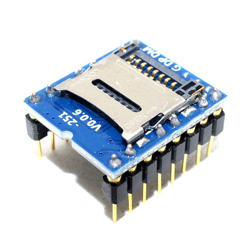 Operating Voltage: DC2.5~3.6V Quiescent Current: 16uA (SD card is not inserted) Supports the SD card maximum capacity of 1G; Supports playback of 4Bit ADPCM format files; Automatically recognize the voice files; Can be loaded for 6KHz to 32KHz, 36KHz sampling rate AD4 audio; Can be loaded for 6KHz~16KHz WAV audio sample rate; Can store up to 512 voice; WTV020-SD-20S, WTV020-SD-16P two module types; Voice playback can call any paragraphs; Power-down save operation data capabilities; Support files combination play, mute combination included; The default mode is serial control mode Dimensions: Approx. 0.78*0.71*0.47 inch / 2*1.8*1.2cm